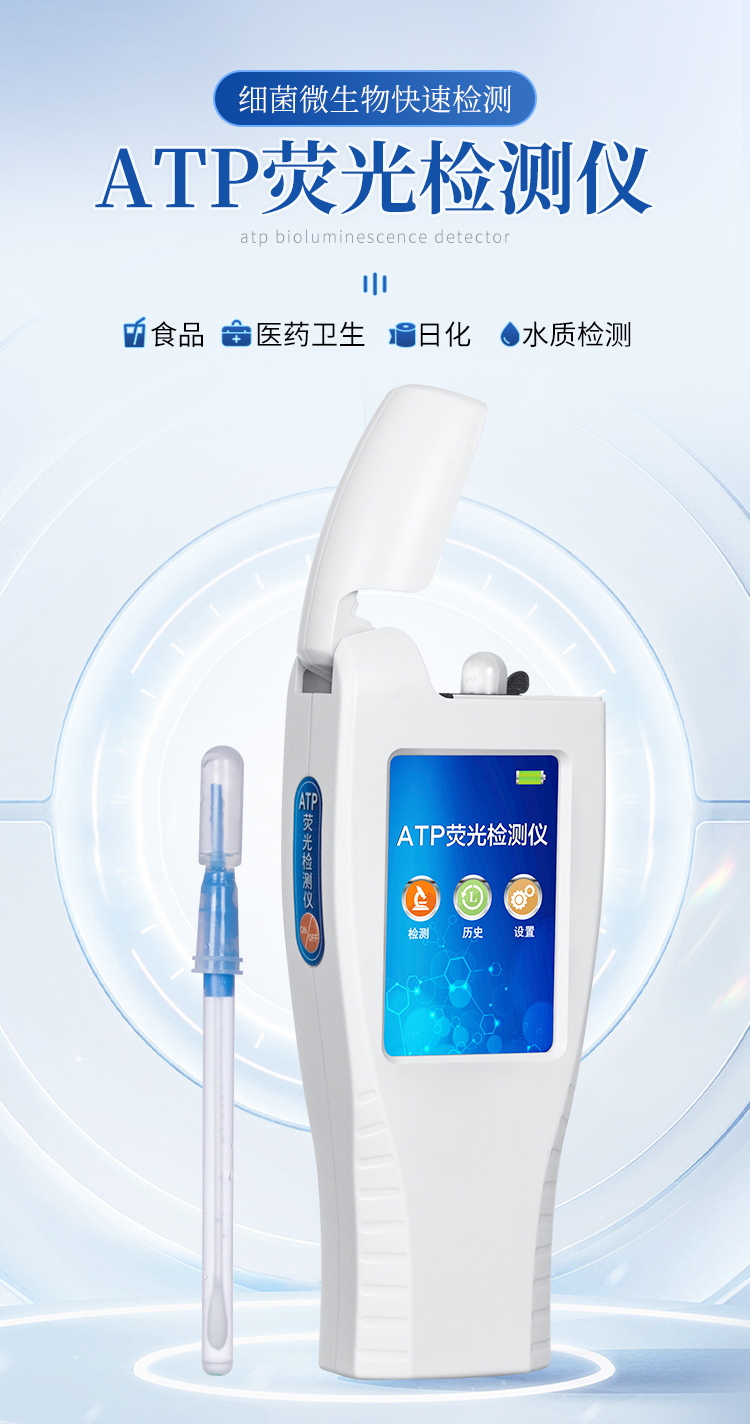 该设备为全新升级产品,安卓智能操作系统。操作采用生物化学反应方法检测ATP含量,ATP荧光检测仪基于萤火虫发光原理,利用“荧光素酶—荧光素体系”快速检测三磷酸腺苷(ATP)。ATP拭子含有可以裂解细胞膜的试剂,能将细胞内ATP释放出来,与试剂中含有的特异性酶发生反应,产生光,再用荧光照度计检测发光值,微生物的数量与发光值成正比,由于所有生物活细胞中含有恒量的ATP,所以ATP含量可以清晰地表明样品中微生物与其他生物残余的多少,用于判断卫生状况。