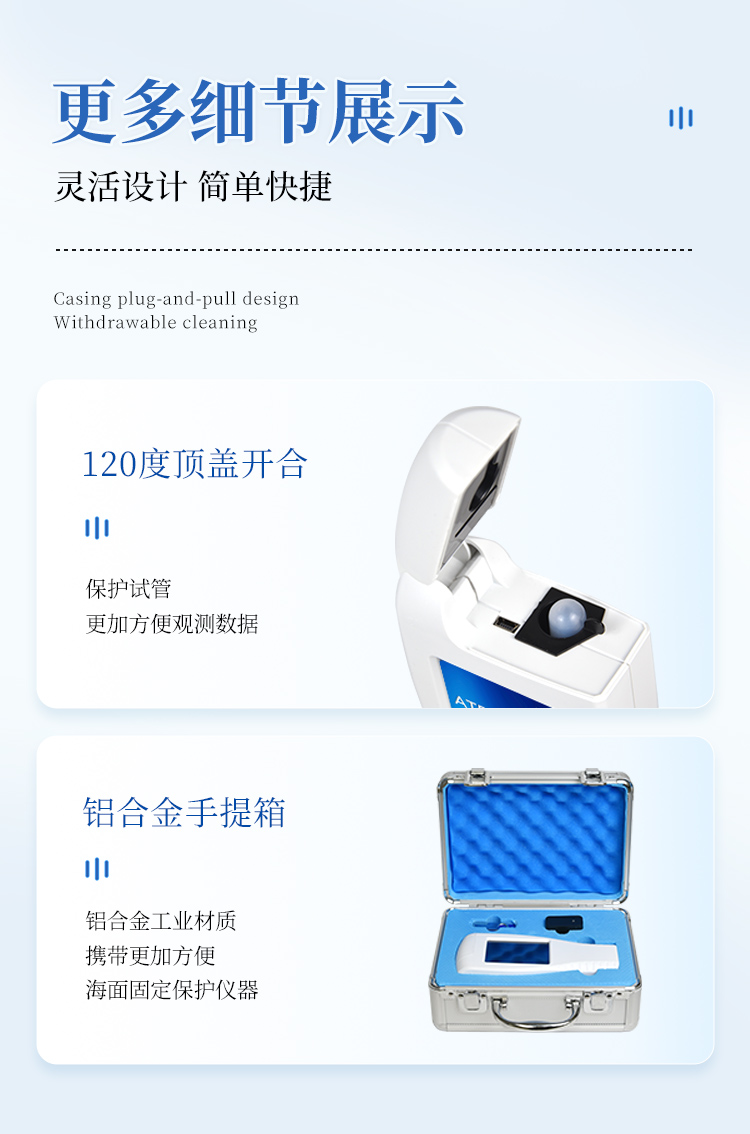 随机配置:ATP荧光检测仪(手持)主机、铝合金手提箱、驱动U盘、仪器包、挂绳、PC数据线、数据分析软件、中文操作手册