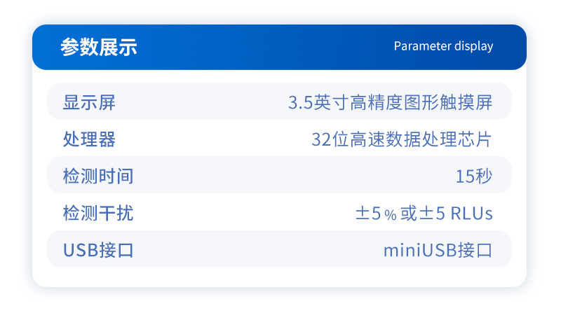 该设备为全新升级产品,大屏幕触摸显示屏,代替传统按键。操作采用生物化学反应方法检测ATP含量,ATP荧光检测仪基于萤火虫发光原理,利用“荧光素酶—荧光素体系”快速检测三磷酸腺苷(ATP)。ATP拭子含有可以裂解细胞膜的试剂,能将细胞内ATP释放出来,与试剂中含有的特异性酶发生反应,产生光,再用荧光照度计检测发光值,微生物的数量与发光值成正比,由于所有生物活细胞中含有恒量的ATP,所以ATP含量可以清晰地表明样品中微生物与其他生物残余的多少,用于判断卫生状况。