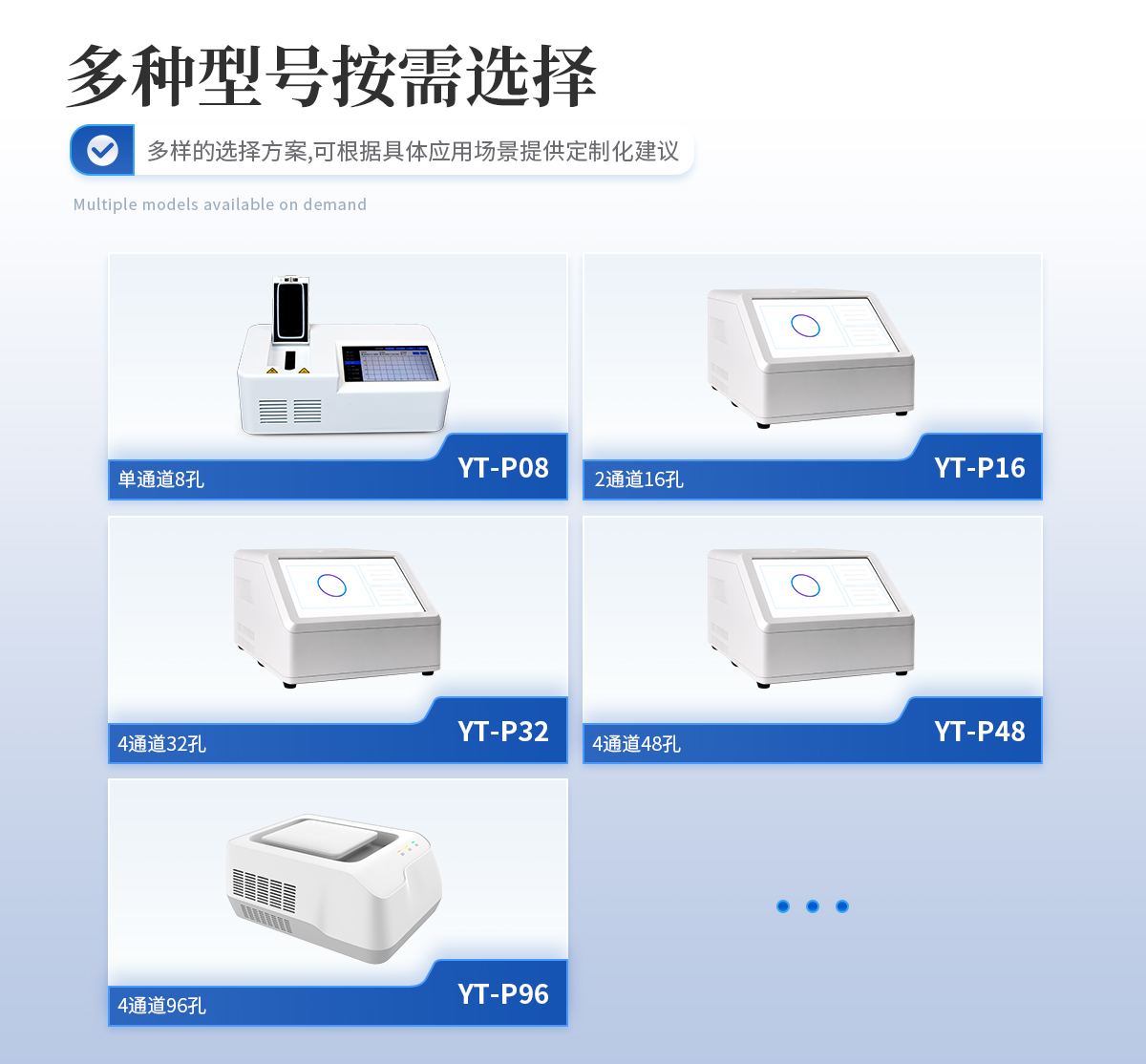 YT-P08型号 实时荧光定量PCR仪器的原理:聚合酶链式反应(polymerase chain reaction,PCR)是一种用于放大扩增特定的DNA片段的分子生物学技术,它可看作是生物体外的特殊DNA扩增,由高温变性、低温退火及适温延伸等几步反应组成一个温度循环周期,使目的基因得以迅速扩增,具有特异性强、灵敏度高、操作简便、省时等特点,是基因扩增技术的一次重大革新。PCR技术可将极微量的目标DNA特异地扩增上百万倍,从而大大提高对DNA分子的分析和检测能力。